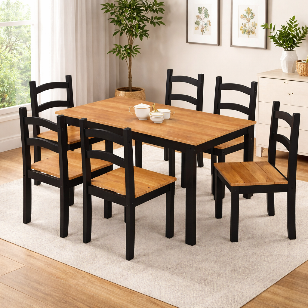 Transforma tu espacio con el elegante juego de comedor de 6 sillas de Almacén de colchones. Este conjunto, elaborado en madera de alta calidad, ofrece un toque rústico y campestre que complementará tu hogar a la perfección. Con una mesa rectangular de dimensiones 140 cm x 70 cm y una altura de 74,5 cm, proporciona un espacio ideal para compartir momentos inolvidables con familiares y amigos.