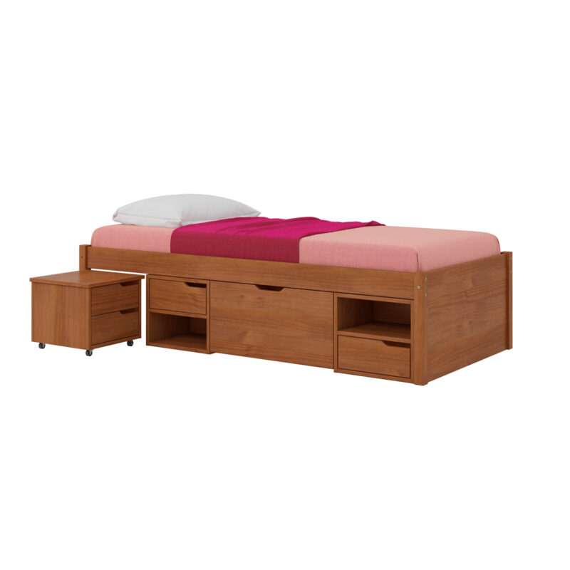 2 mesas de luz funcional, con cajones y espacio abierto para apoyar objetos de uso diario.
