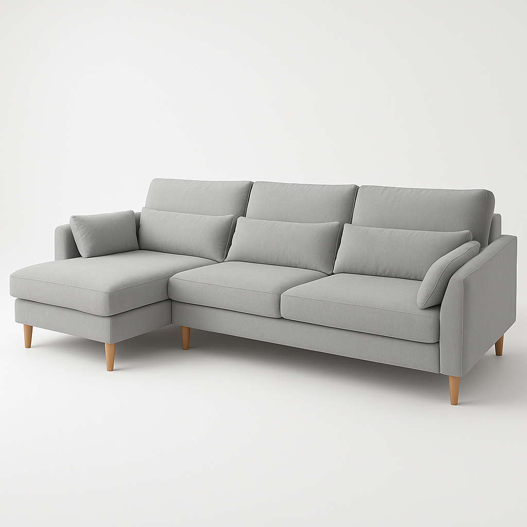 Transformá tu living en un espacio sofisticado y acogedor con nuestro sofá esquinero en tela gris. Diseñado para brindar confort y estilo, este sofá combina líneas modernas con una textura suave al tacto, ideal para cualquier ambiente contemporáneo o nórdico.